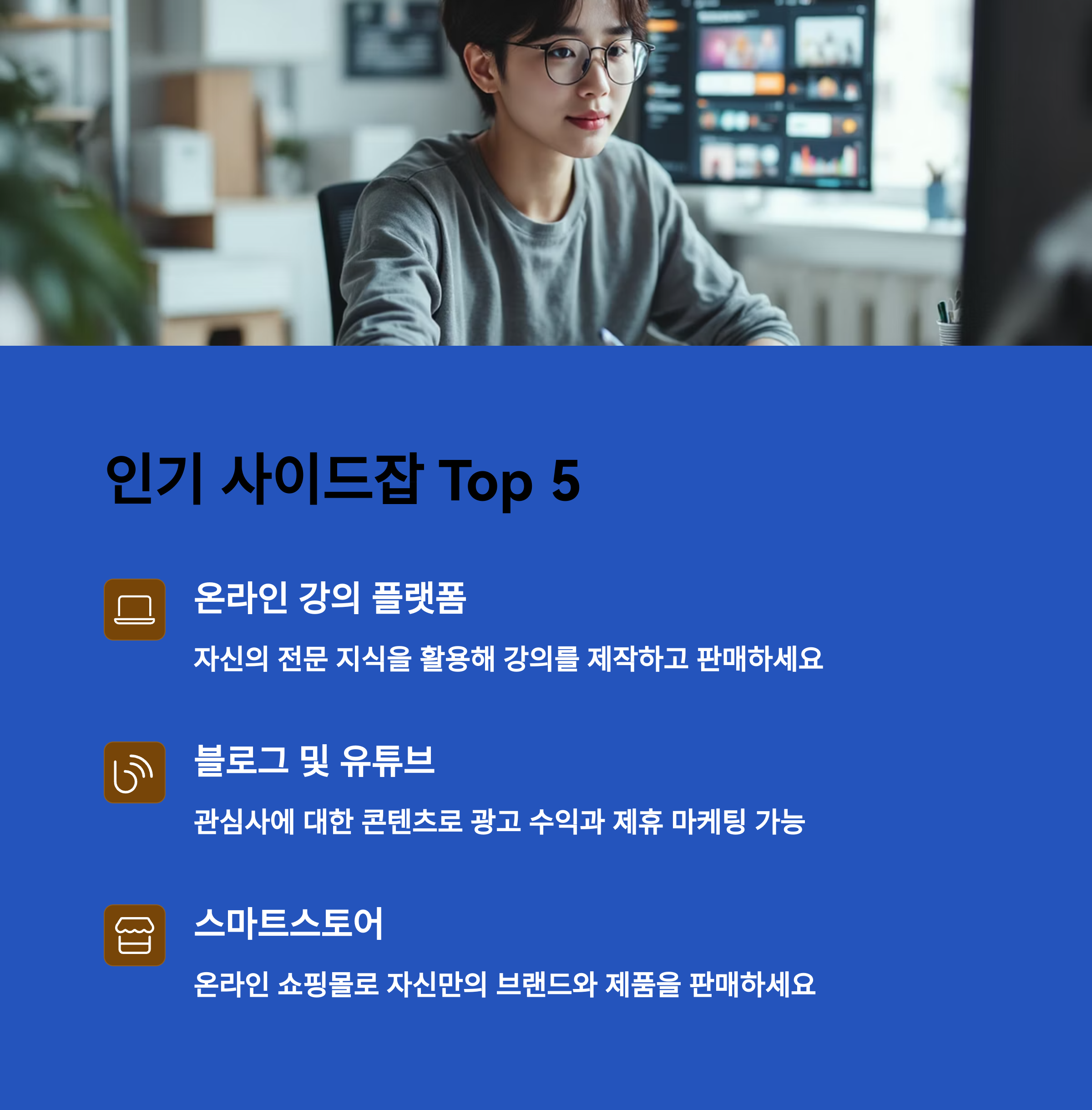 안녕하세요 여러분 😊 요즘 부업, 사이드잡, 제2의 직업에 대해 관심 많으시죠? 사실 저도 퇴근 후 뭘 할 수 있을까 고민하다가 시작했던 블로그가 지금은 제 세컨드 커리어가 되었답니다. 그래서 오늘은, 시간은 없고 하고 싶은 건 많은 분들을 위해, 지금 핫하게 떠오르는 제2의 직업 인기 업종을 정리해봤어요. 혹시 읽다가 '어? 이건 나도 할 수 있겠는데?' 싶은 게 있으면 망설이지 마세요. 지금 시작해도 늦지 않았어요!
