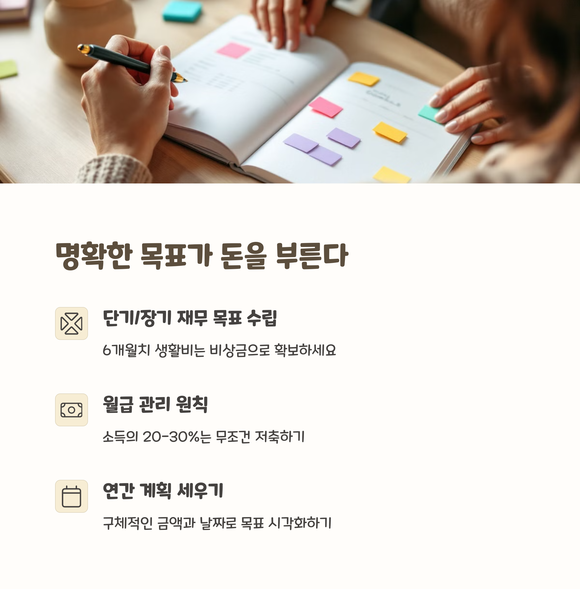 모든 재테크는 목표 설정에서 시작해요. '언제까지, 얼마를, 어떤 목적으로'라는 3가지 질문에 스스로 답해보세요. 예를 들면, 1년 안에 300만 원 모아서 해외여행 가기, 3년 안에 전세 자금 3000만 원 만들기 같은 것들이죠.