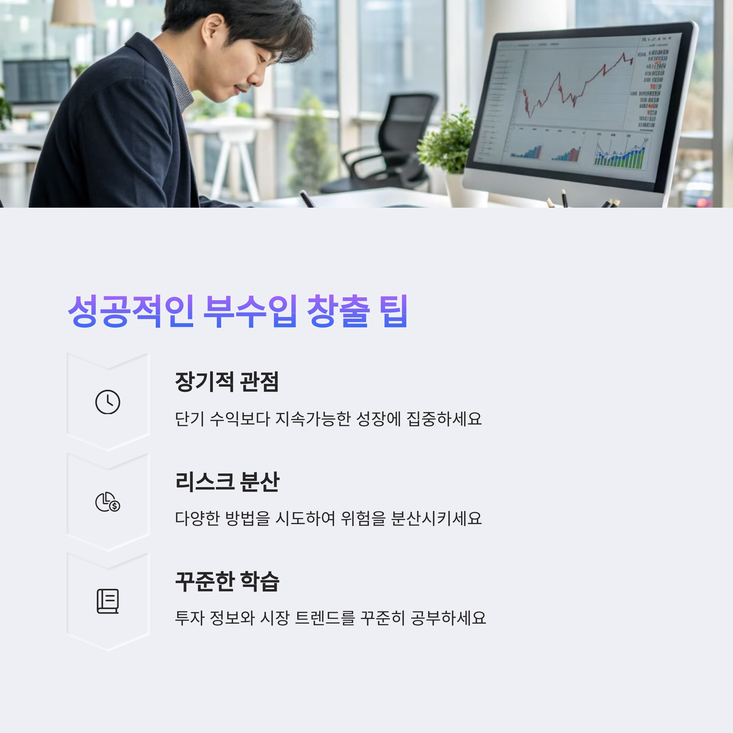 부수입 투자의 핵심은 ‘장기적 관점’과 ‘분산 투자’입니다. 단기적인 수익을 쫓기보다는 시간이 줄 수 있는 복리 효과를 믿고 계획적으로 접근하는 것이 필요합니다. 또한 하나의 자산에 집중하기보다는 위험을 나누는 방식으로 자산을 분산해두면 예기치 못한 손실에도 대비할 수 있습니다.