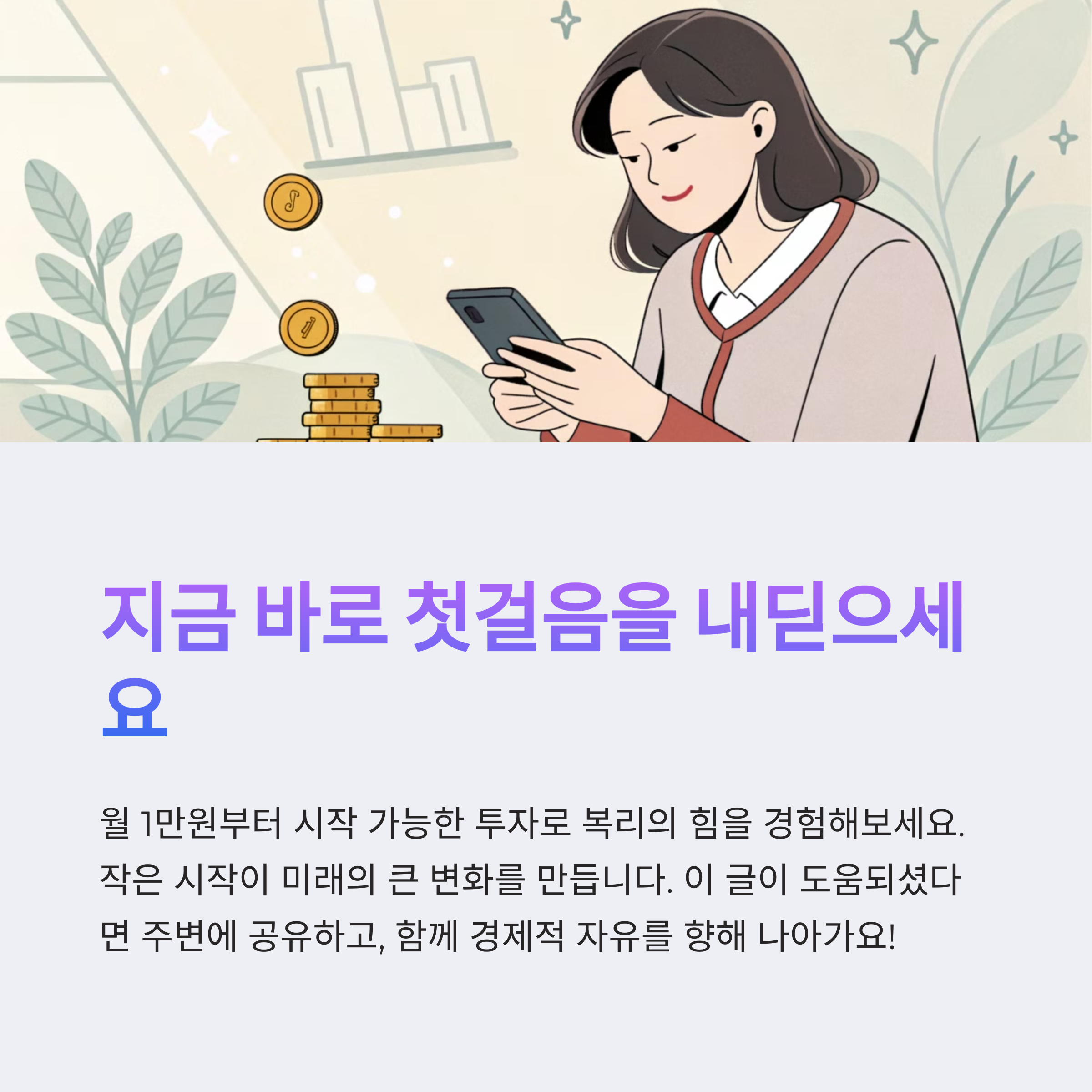 월급 외의 수입을 만드는 일은 더 이상 선택이 아닌 필수입니다. 투자라고 해서 거창하거나 위험한 것이 아닌, 지금 당장 실천할 수 있는 소액 분산 전략으로도 충분히 시작할 수 있습니다. 중요한 건 '시작하는 용기'와 '꾸준함'입니다. 오늘이 가장 빠른 날입니다. 여러분의 작은 선택이 미래를 바꿉니다.