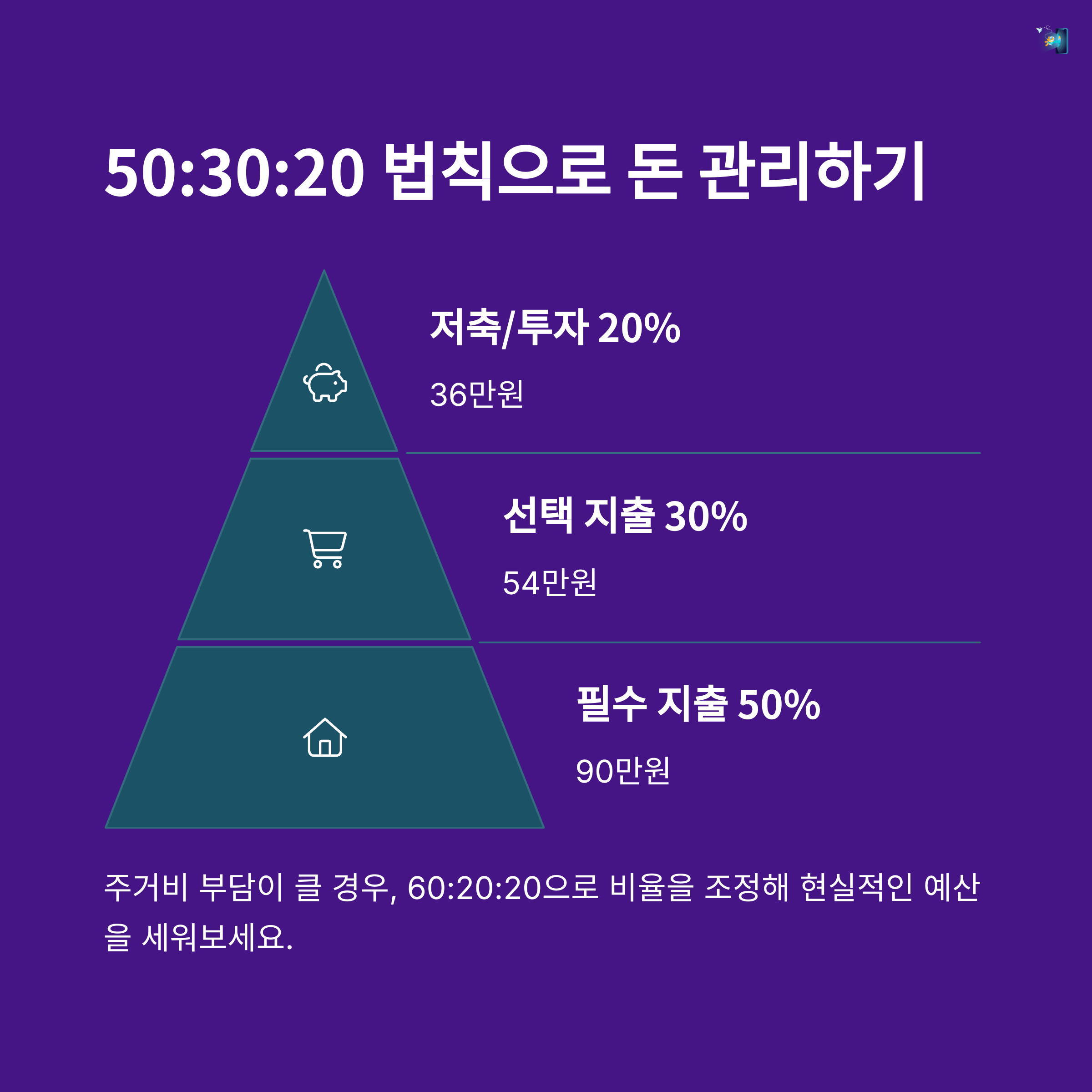 많이 들어보셨죠? 수입의 50%는 필수지출, 30%는 여가, 20%는 저축에 쓰라는 공식. 근데 월급 200이라면 30% 여가는 좀 사치일 수도 있어요. 그래서 저는 50:20:30으로 바꿨어요. 즉, 필수지출 50%, 저축 30%, 여가/변동비는 20%만 쓰는 거죠. 이게 현실적으로 훨씬 더 맞았어요.
