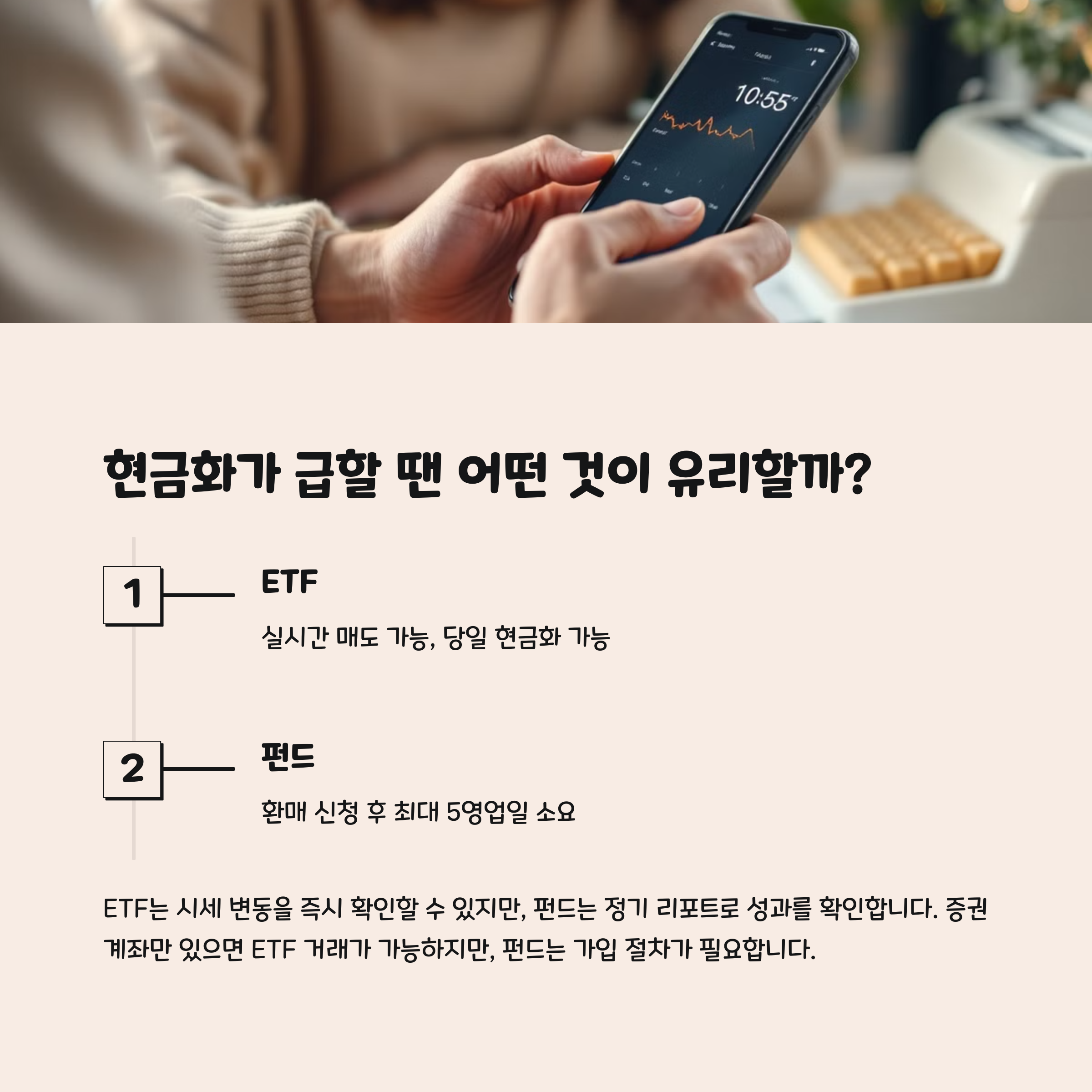 ETF는 주식처럼 원하는 시간에 사고팔 수 있어 유동성이 매우 좋아요. 반면 펀드는 하루 기준가 기준으로만 매매되기 때문에 환금성에서 불리하죠. 그래서 단기 매매나 시세 확인을 자주 하는 투자자에겐 ETF가 더 편해요.