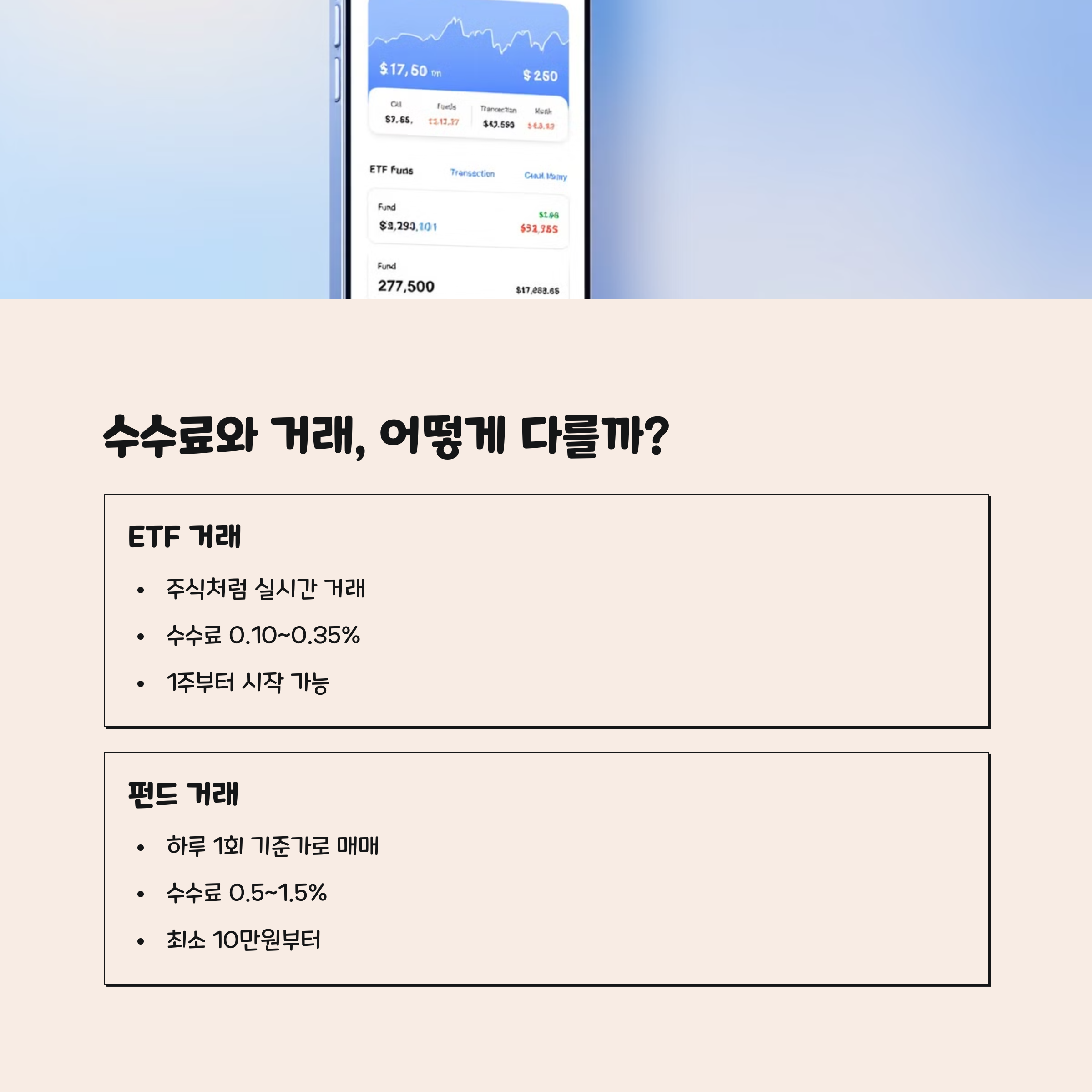 ETF는 주식처럼 실시간으로 사고팔 수 있기 때문에 증권사 거래 수수료가 발생해요. 하지만 운용 보수는 펀드보다 훨씬 저렴한 편이죠. 반면 펀드는 운용보수 외에도 판매 수수료가 붙는 경우도 있어요.