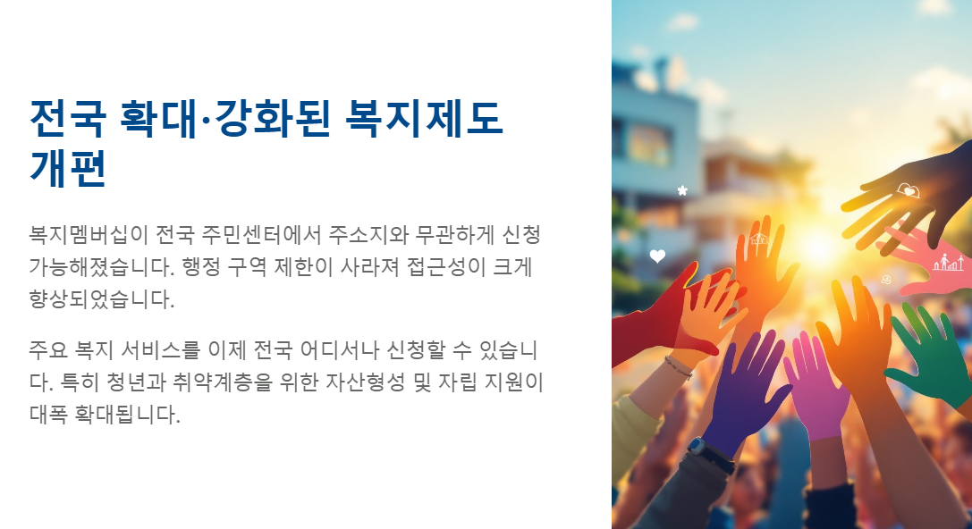혹시 ‘복지멤버십’ 들어보신 적 있나요? 이건 정부에서 제공하는 다양한 복지 혜택을 한 번에 확인하고 신청할 수 있게 해주는 시스템이에요. 사실 그동안은 소득이나 재산, 가족 상황에 따라 받을 수 있는 혜택이 다 달라서, 내가 뭘 받을 수 있는지 알아보기도 벅찼잖아요. 그런데 이제는 주소지와 관계없이 가까운 주민센터에서 바로 신청할 수 있게 바뀌었답니다!