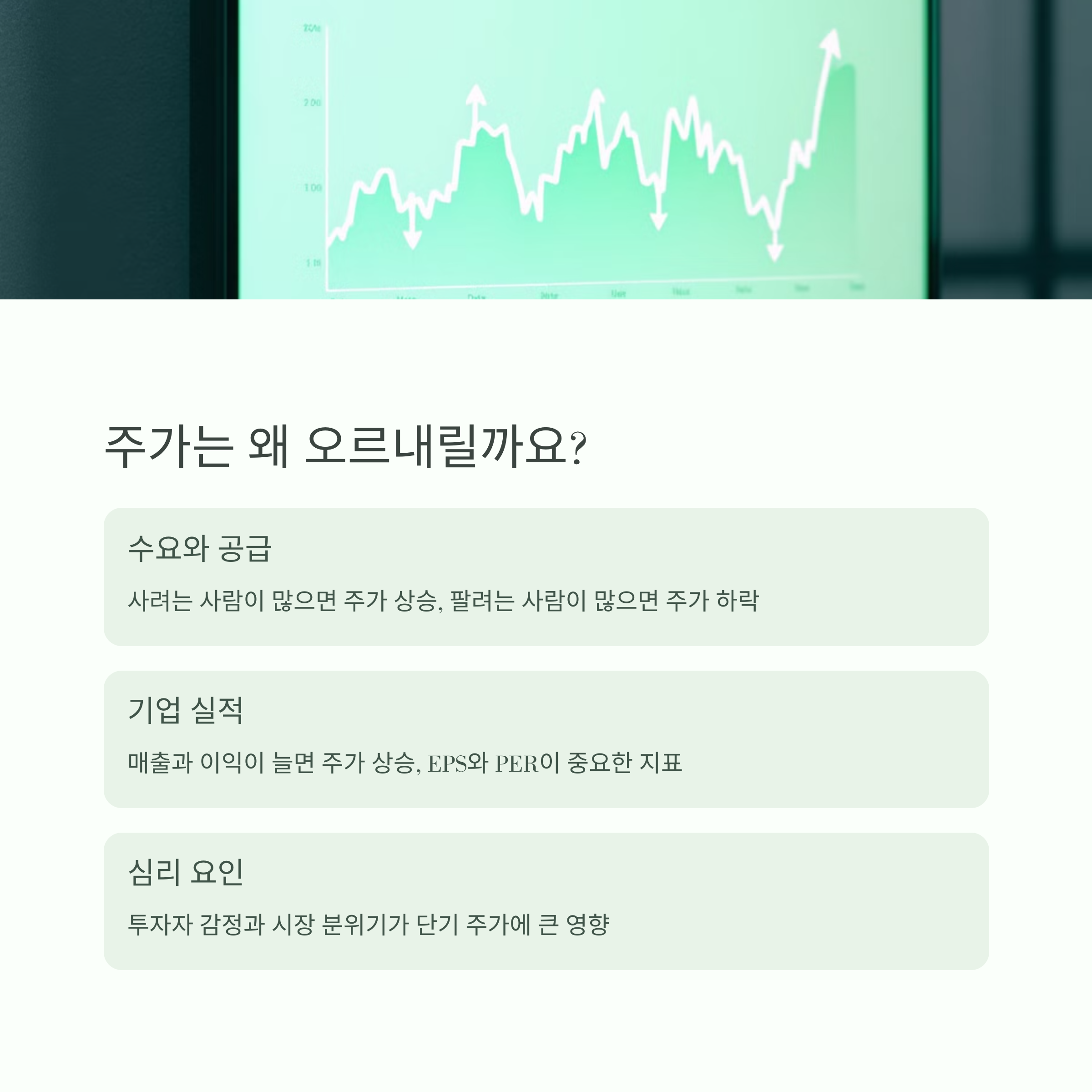 주가가 오르고 내리는 이유는 수요와 공급 때문이에요. 사려는 사람이 많으면 가격이 오르고, 팔려는 사람이 많으면 떨어지는 거죠. 그런데 단순히 그것뿐만 아니라, 시장 분위기, 뉴스, 실적 발표, 경제 지표 등도 영향을 줘요. 그래서 이걸 예측하는 게 참 어렵고, 그래서 재미있습니다(?)!