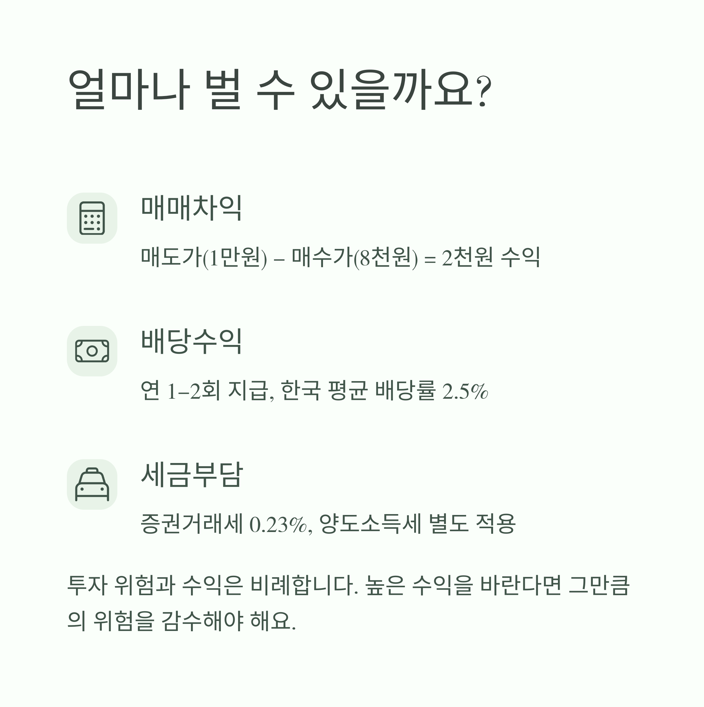주식은 투자한 만큼 수익을 얻을 수도 있지만, 그만큼 손실도 감수해야 해요. 어떤 경우에 수익이 생기고 손실이 발생하는지 알아두는 게 기본 중의 기본이에요.