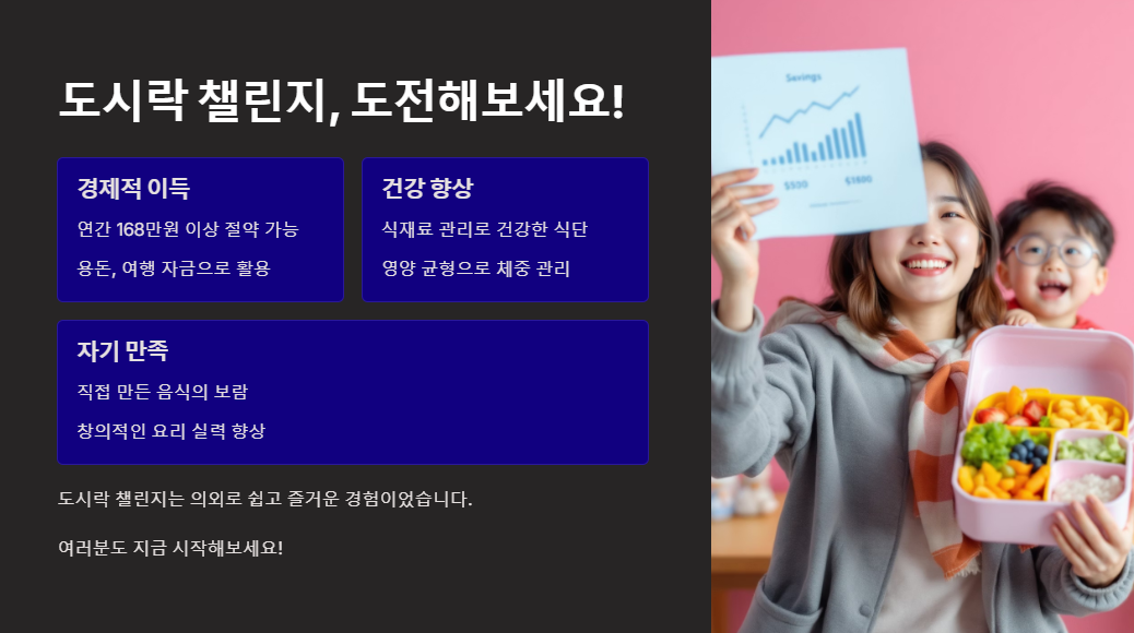 지금까지 직장인 도시락 챌린지에 대해 솔직하게 풀어봤어요. 시작은 단순했지만, 매일매일 도시락을 챙기면서 제 생활이 바뀌고, 생각보다 많은 돈도 절약하게 되었죠. 여러분도 혹시 고민 중이라면, 이번 달 도전해보시는 거 어때요? 절약, 건강, 루틴까지 챙기는 경험이 될 거예요. 함께 도전하고, 우리만의 도시락 루틴 만들어봐요!