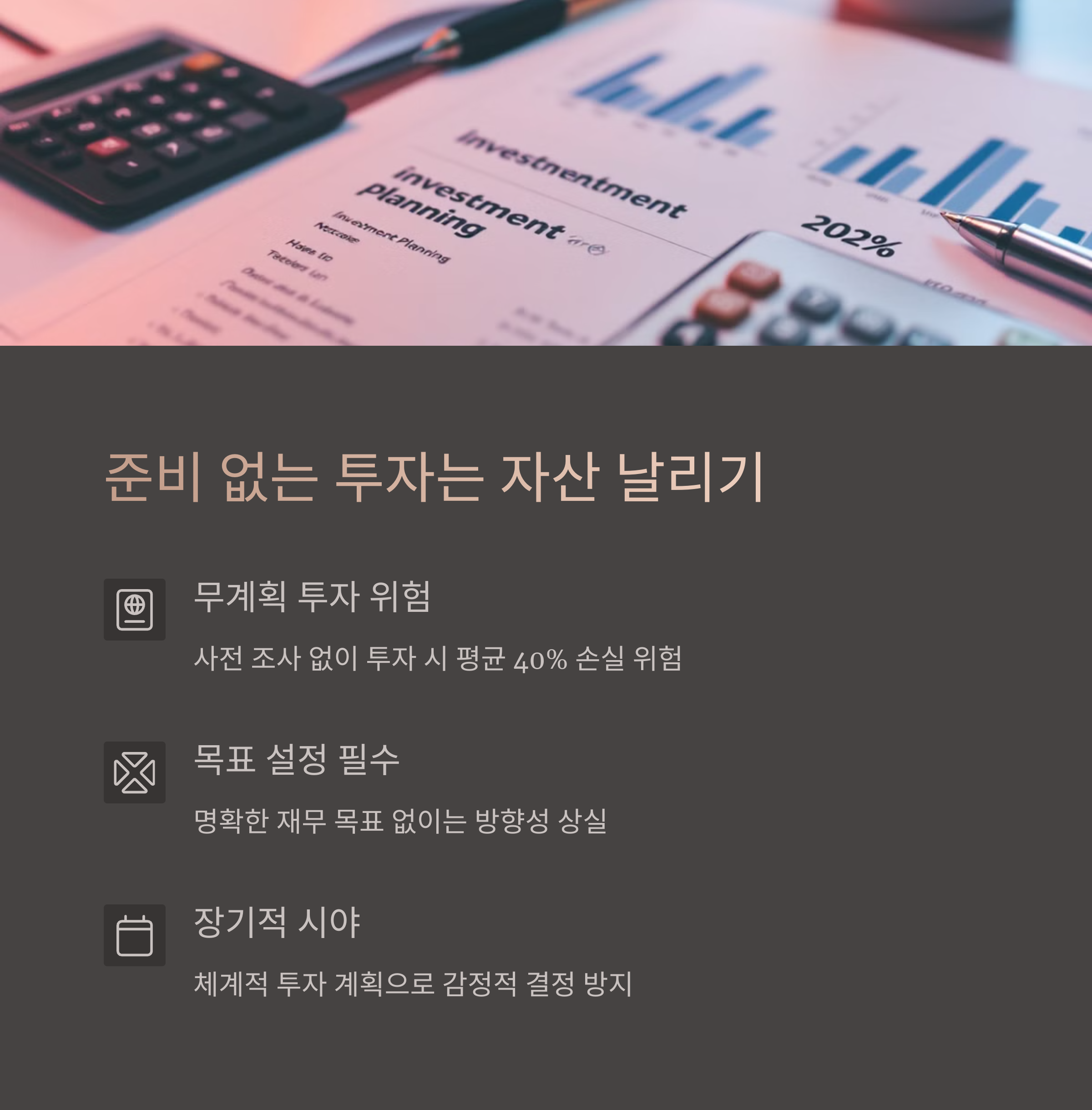 가장 흔한 실수는 '무계획 투자'입니다. 방향 없는 투자는 거의 항상 후회를 남깁니다.