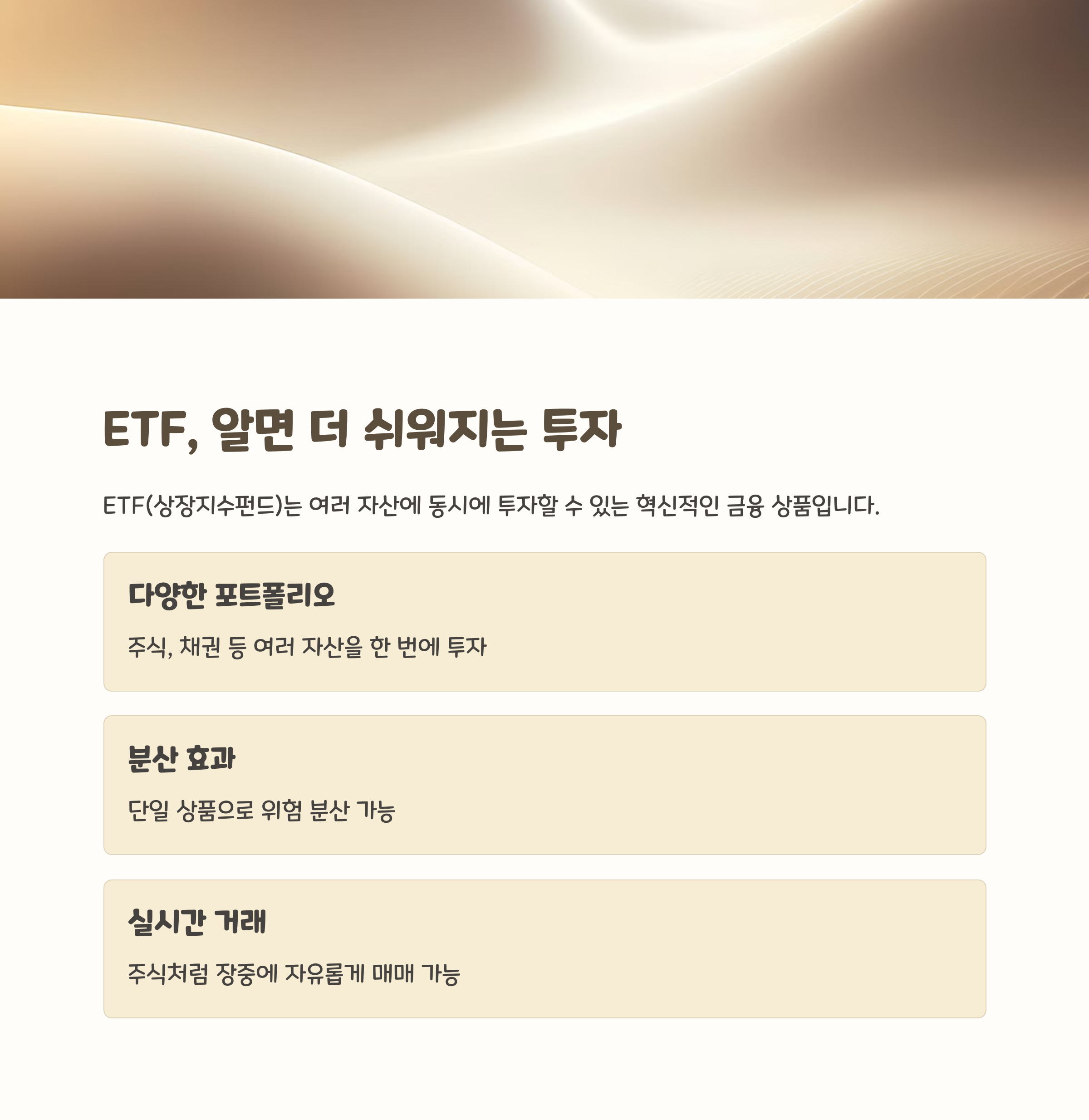 안녕하세요! 혹시 ETF라는 단어, 들어만 보고 정확히 뭔지 몰라서 그냥 넘기셨던 적 있으신가요? 저도 그랬어요. 처음엔 '이게 뭐지? 펀드인가, 주식인가?' 싶었는데 알고 보니 정말 똑똑한 녀석이더라고요. 투자에 대해 잘 몰라도 ETF 하나만 잘 활용하면 포트폴리오가 확 달라진다고 해도 과언이 아닙니다. 오늘은 투자 왕초보도 단번에 이해할 수 있도록 ETF를 진짜 쉽고 간단하게 설명드릴게요. 복잡한 용어 없이, 마치 친구한테 말하듯 풀어드릴게요!
