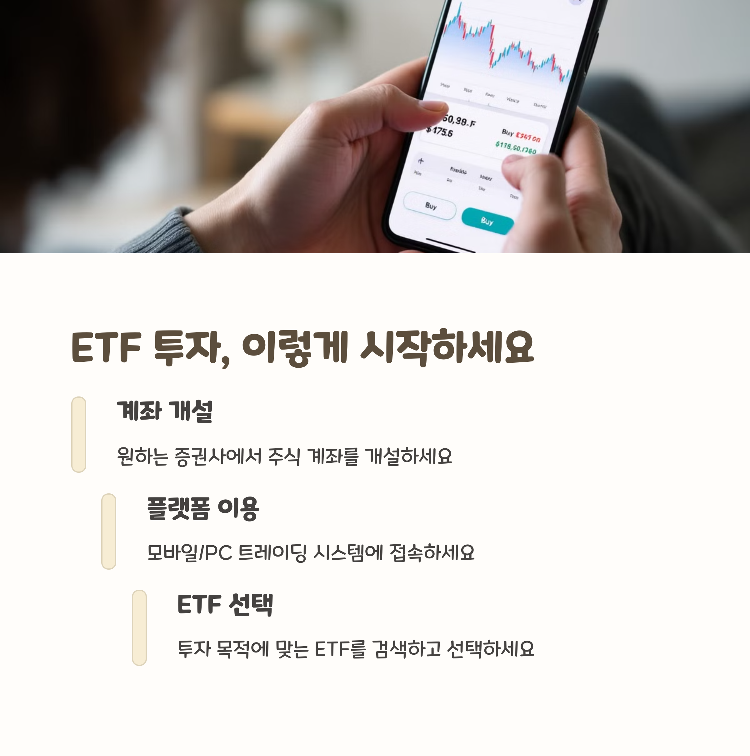 너무 쉬워서 놀라실 수도 있어요. 증권사 앱(예: 삼성증권, 키움, 미래에셋 등)에 로그인해서 종목 검색창에 ETF 이름을 입력하고 매수 버튼만 누르면 끝! 삼성전자 사듯이 ETF도 그냥 클릭 몇 번이면 거래됩니다.