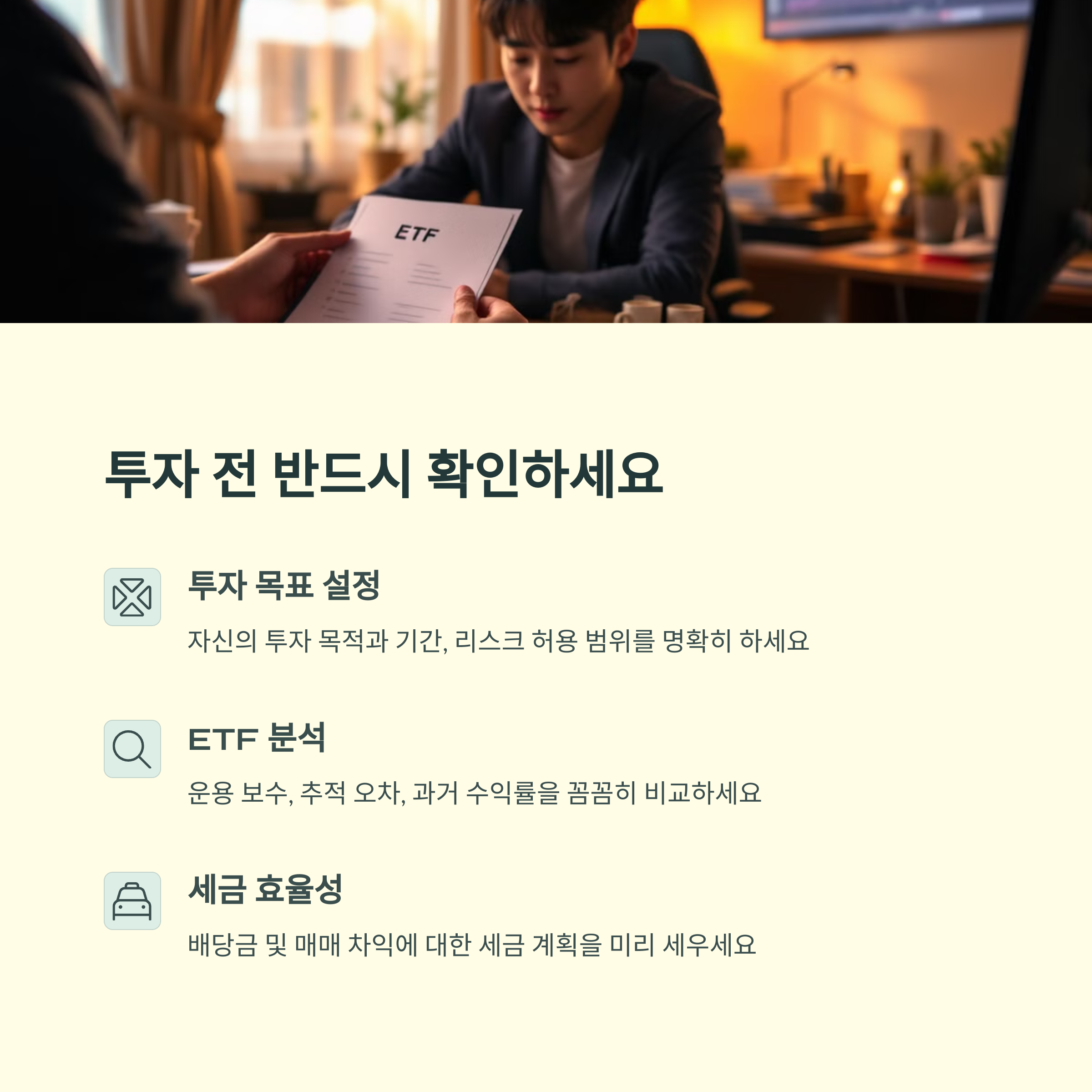 ETF는 복잡한 재테크가 아닌, 누구나 쉽게 시작할 수 있는 똑똑한 투자 수단입니다. 주식처럼 매매하면서도 펀드처럼 분산 효과를 누릴 수 있다는 점에서, 초보 투자자에게 특히 추천하고 싶어요. 오늘 알려드린 기초와 실전 팁으로 이제 여러분도 ETF 투자 첫걸음을 자신 있게 내디딜 수 있을 거예요! 궁금한 점이나 본인만의 ETF 팁이 있다면 댓글로 함께 나눠주세요 :)