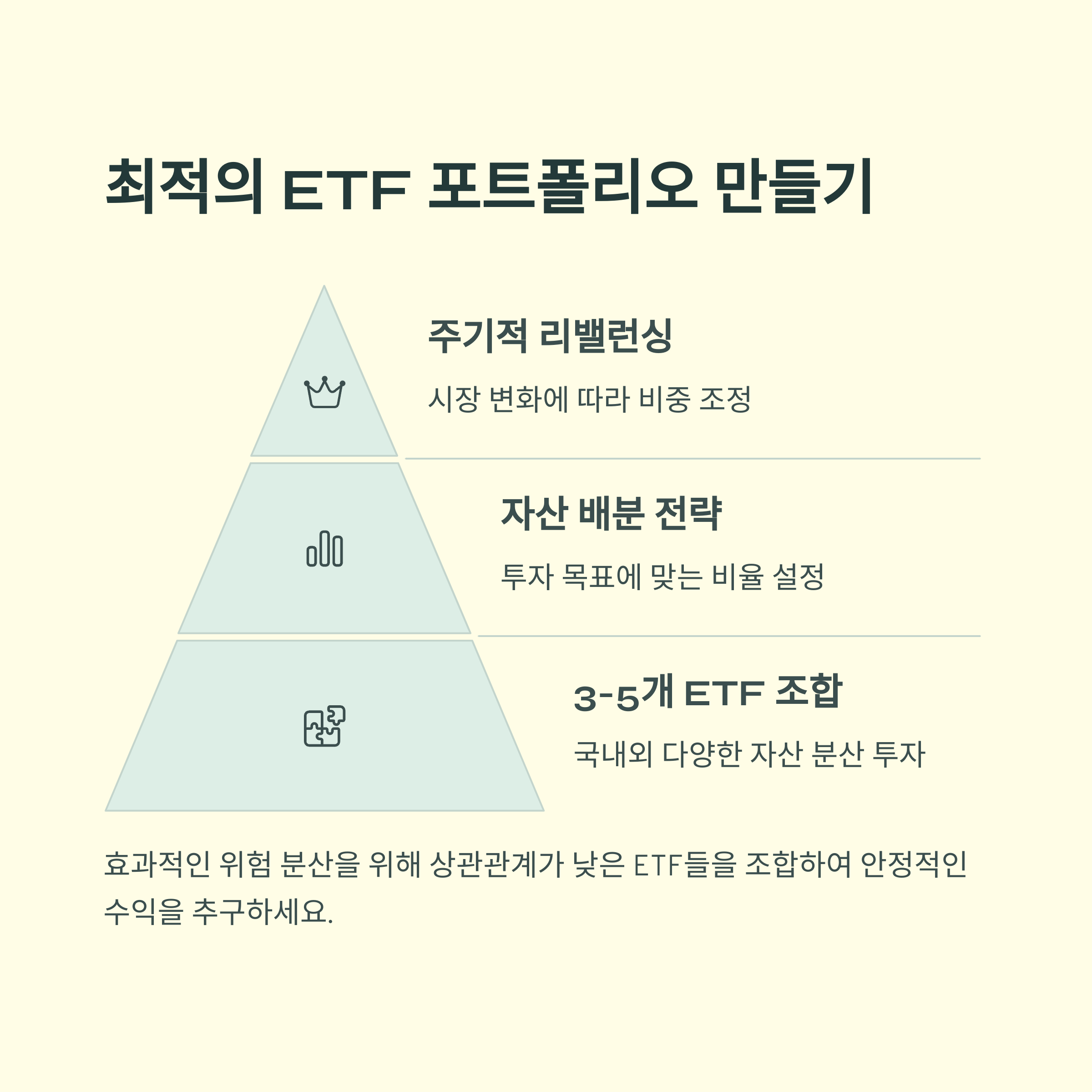 ETF는 분산 투자에 아주 유리하기 때문에, 몇 종목만 잘 골라도 균형 잡힌 포트폴리오를 만들 수 있어요. 예를 들어 S&P500 ETF, 국내 코스피 ETF, 2차전지 섹터 ETF를 조합하면 글로벌+국내+테마 투자가 동시에 가능하죠.